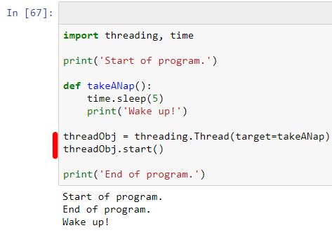 threadObj = threading.Thread(target=print, args=['Cats', 'Dogs', 'Frogs'], kwargs={'sep': ' & '})
