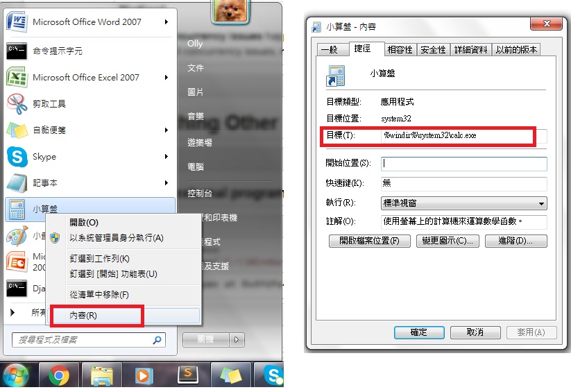 Right-click the application’s Start menu item and select Properties to view the application’s filename.